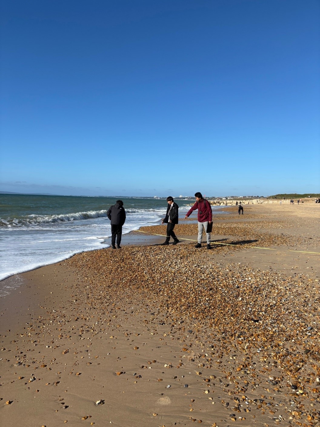 The purpose of our trip was to collect data that would help us to answer our key question: ‘To what extent does beach width vary at Hengistbury head?’ We went to three different sites and at each site we were split into groups of 4/5. We measured how wide the beach was as well as the rate of longshore drift. Although we had practised this in class, doing it in the open was slightly more challenging than expected as the wind kept blowing our tape measure, so we had to come together as a team and try and solve that particular problem.