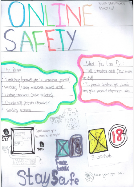 Alla Fedko [7Y]: We made online safety posters so that we can understand that sometimes being online is dangerous, so we wish you all to be safe online and to actually socialise more in real life. We learnt to never make your account public and to never trust people online unless you know them.