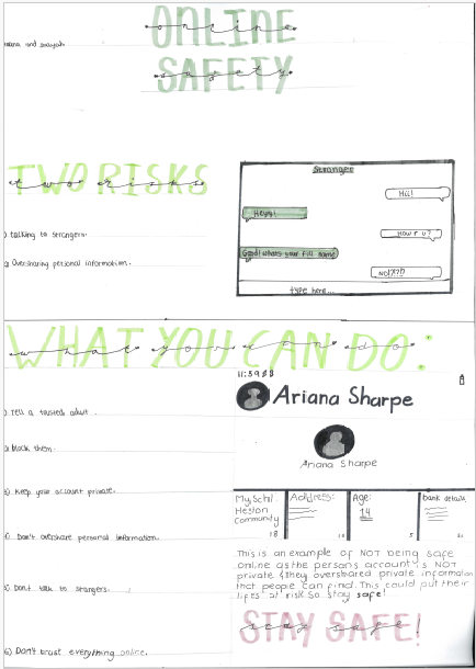 Shanaya Gambhir [7Y]: We made posters based on online safety to make others aware of the dangers that social media can pose. We learnt about keeping all social media accounts private, not sharing personal information with other (addresses, full names, bank details) as well as what to do if you feel unsafe online. We were able to understand the risks through "what would you do" scenarios.